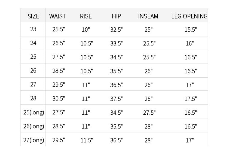 - Measurements from size 26: Rise: 10.5in / 27cm, Inseam: 25.5in / 65cm, Leg opening: 16.75in / 42.6cm