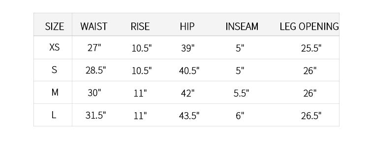 - Measurements from size S: Rise: 10.5in / 26.5cm, Inseam: 5in / 12cm, Leg opening: 26in / 64.8cm