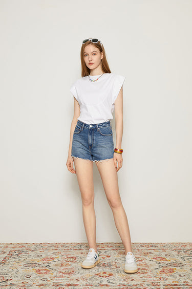 The Joanie Vintage Cut Off Shorts are a timeless summer essential with an effortless, lived-in feel. Crafted from mid-weight, non-stretch denim, they sit high at the waist and feature subtle fading and whiskering for a vintage-inspired look. A raw, frayed hem gives them edge, while the classic 5-pocket styling and button-zip closure keep them versatile for everyday wear. Perfectly petite-friendly, these shorts are designed for all-day comfort in 100% cotton.